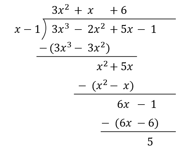 Validation: (x - 1)(3x2 + x + 6) + 5 = (3x3 - 3x2 + x2 - x + 6x - 6) + 5 = 3x3 - 2x2 + 5x - 1 ✓