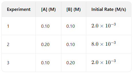 1. Compare Exp 1 and 2: [A] doubles ( $\times 2$ ), [B] stays same. Rate quadruples ( $\times 4$ ). Since $2^m = 4$ , $m = 2$ . (Order in A is 2).